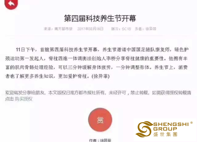 近日,盛世集團【綠色護頸運動】大型公益講座,在全國各地頻頻發起;就這樣熱火朝天的綠色健康風暴活動,引得深圳南方都市報、深圳晶報、湖南瀟湘晨報、長沙晚報、楚天都市報等各大媒體爭相報道。
