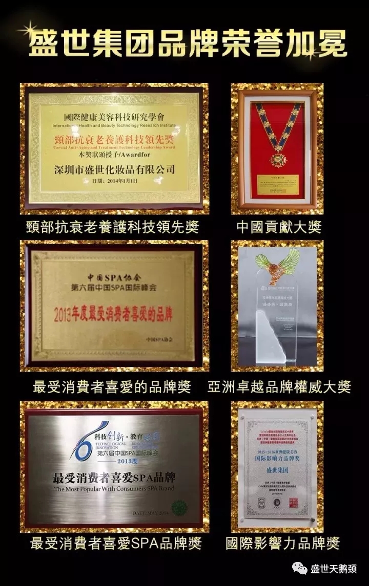 盛世品牌憑借卓越的品質,獲美業權威機構、專家、廣大消費者的一致認可;曾榮獲“2016年度生活美容品牌企業獎”,“2016年度最佳供應商大獎”,“2015中國貢獻大獎”,“2014亞洲卓越品牌權威大獎”,“2013最受消費者喜愛品牌獎”等多項大獎。