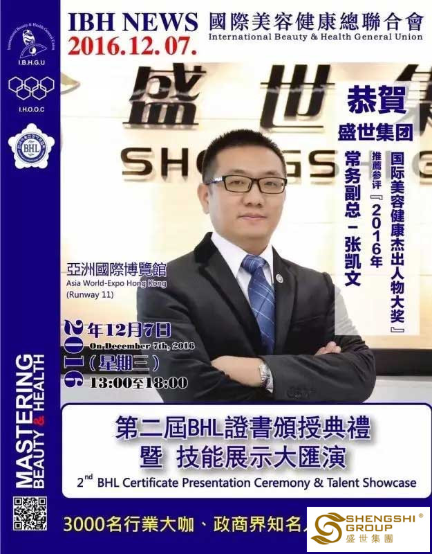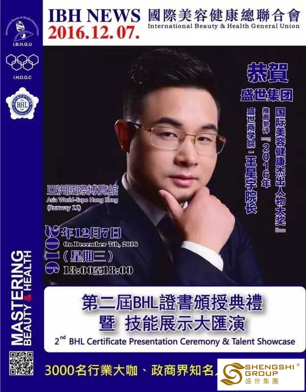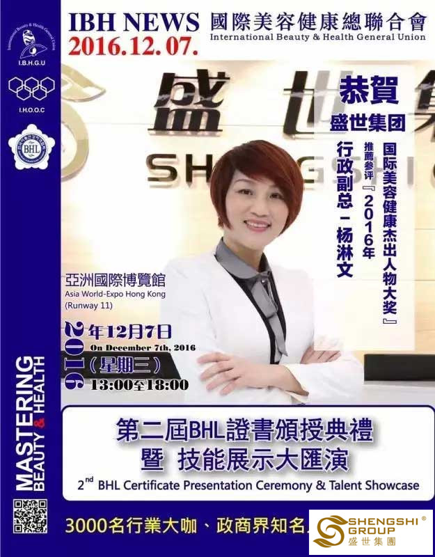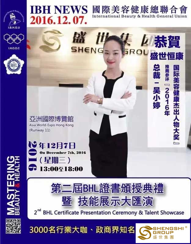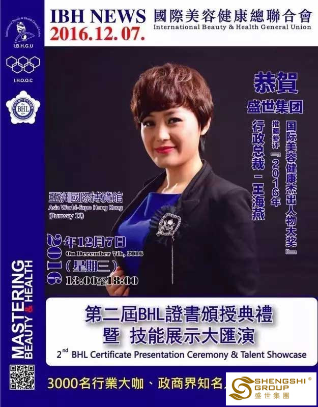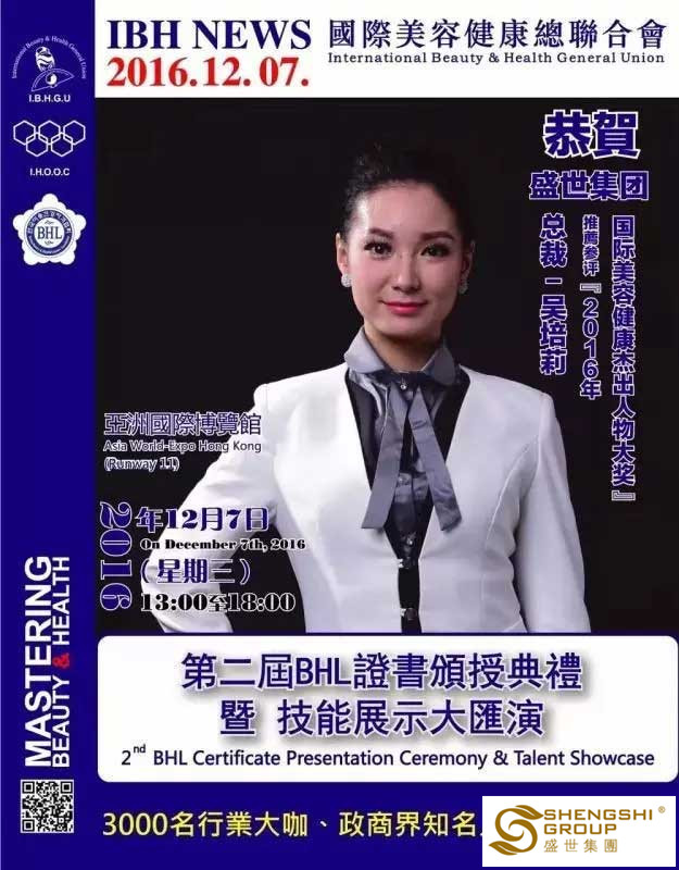 12月7日,國際美容健康總聯合會第二屆BHL證書頒授典禮暨技能展示大匯演,在香港亞洲國際博物館隆重召開。盛世集團高管團隊應邀出席,且盛世董事長王俊華女士榮獲“2016年度亞洲卓越美業企業家領航人物大獎”,六名高管齊獲國際美容健康杰出人物大獎”!